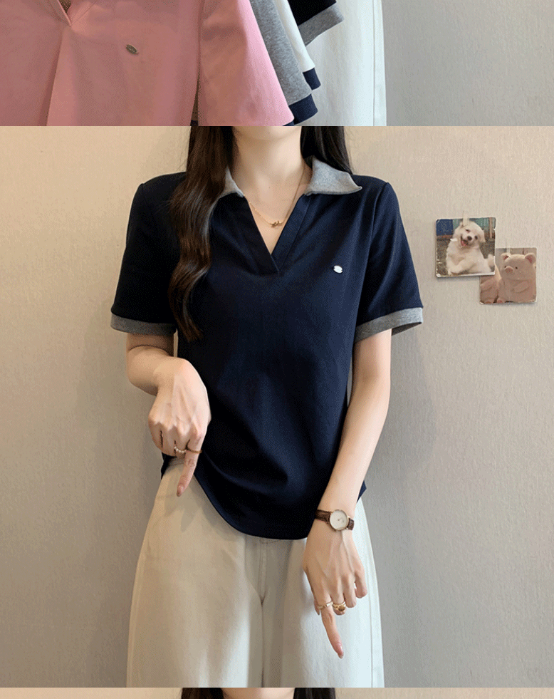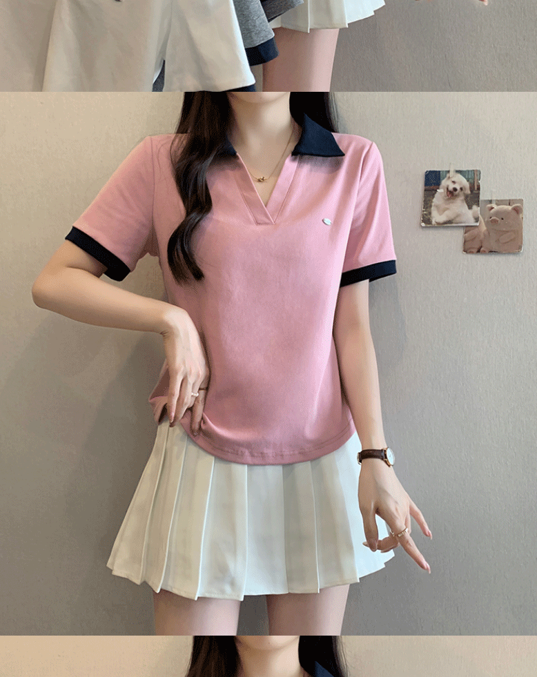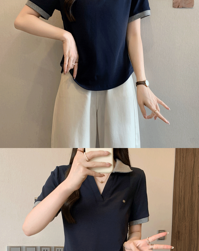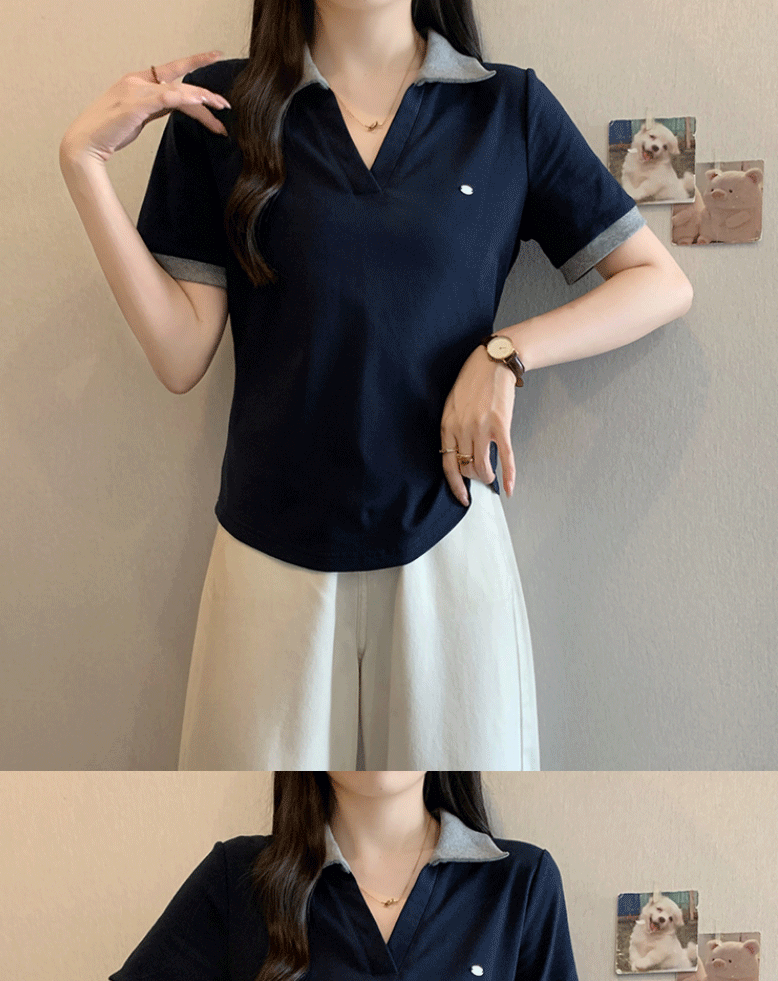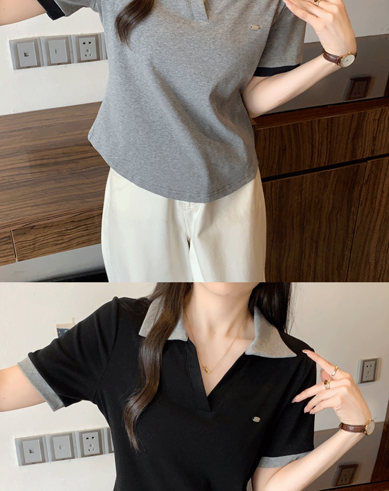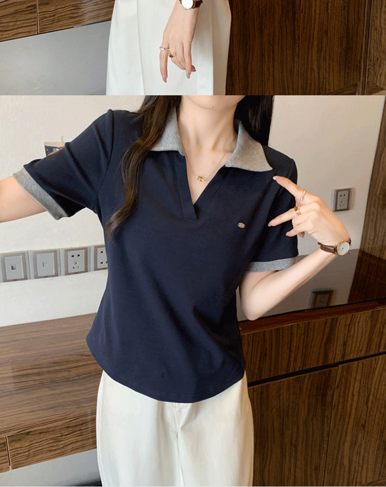 Women's clothing covering belly contrast color v-neck curved shoulder short-sleeved T-shirt female fat MM waist slimming chic tops female