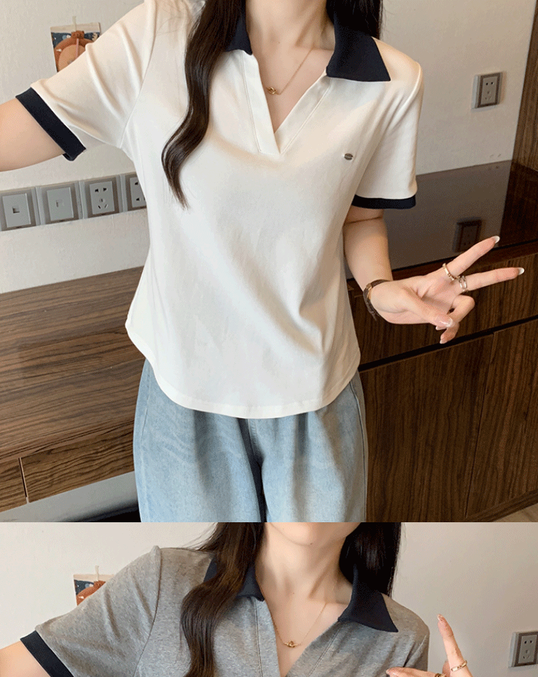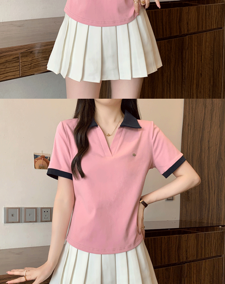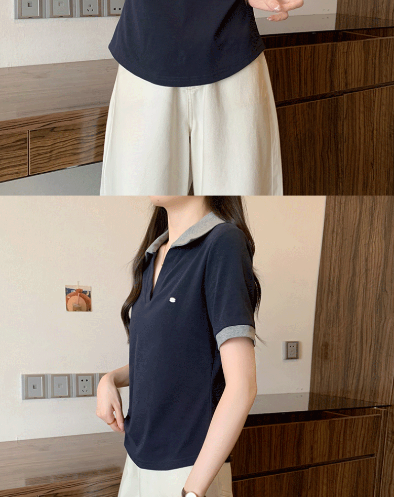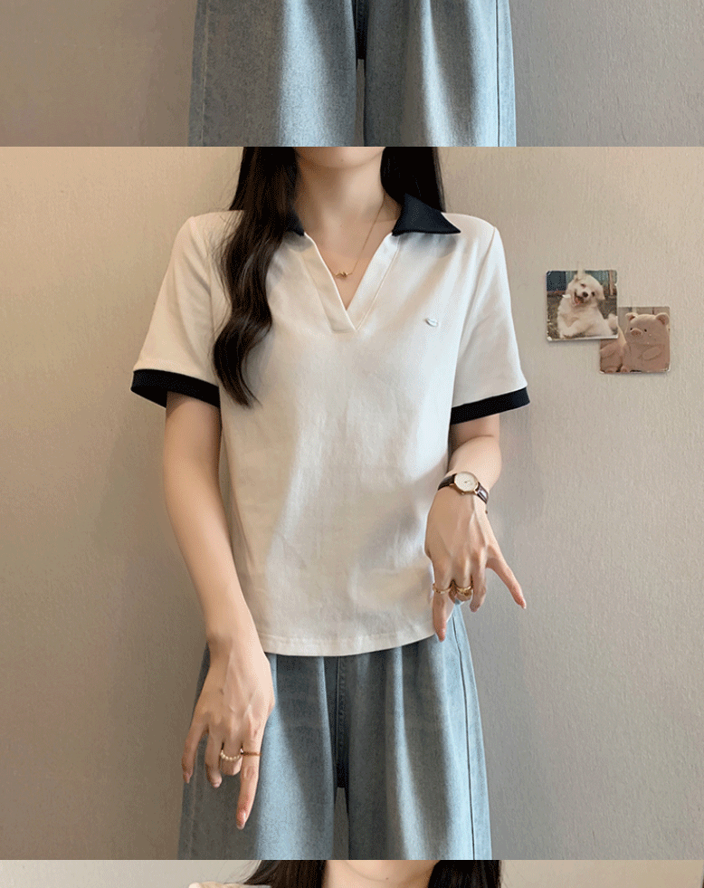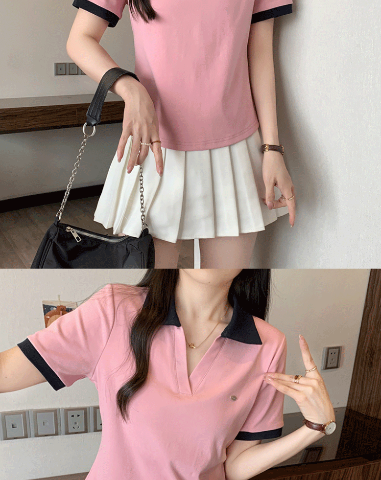 Women's clothing covering belly contrast color v-neck curved shoulder short-sleeved T-shirt female fat MM waist slimming chic tops female