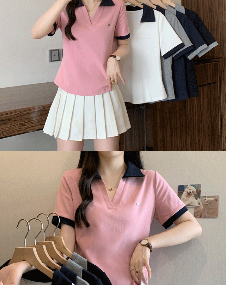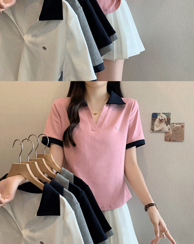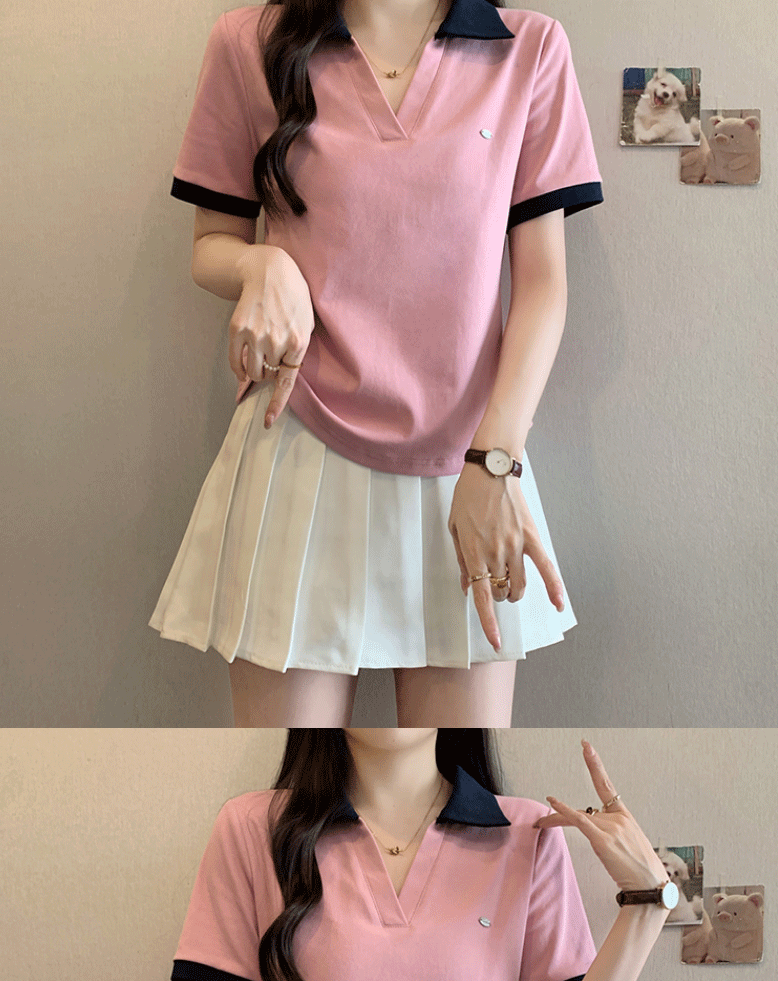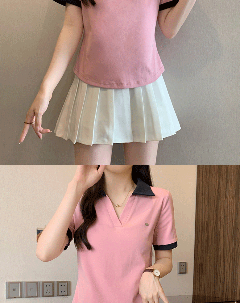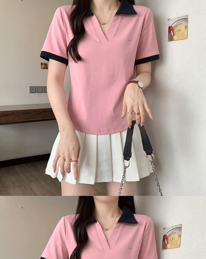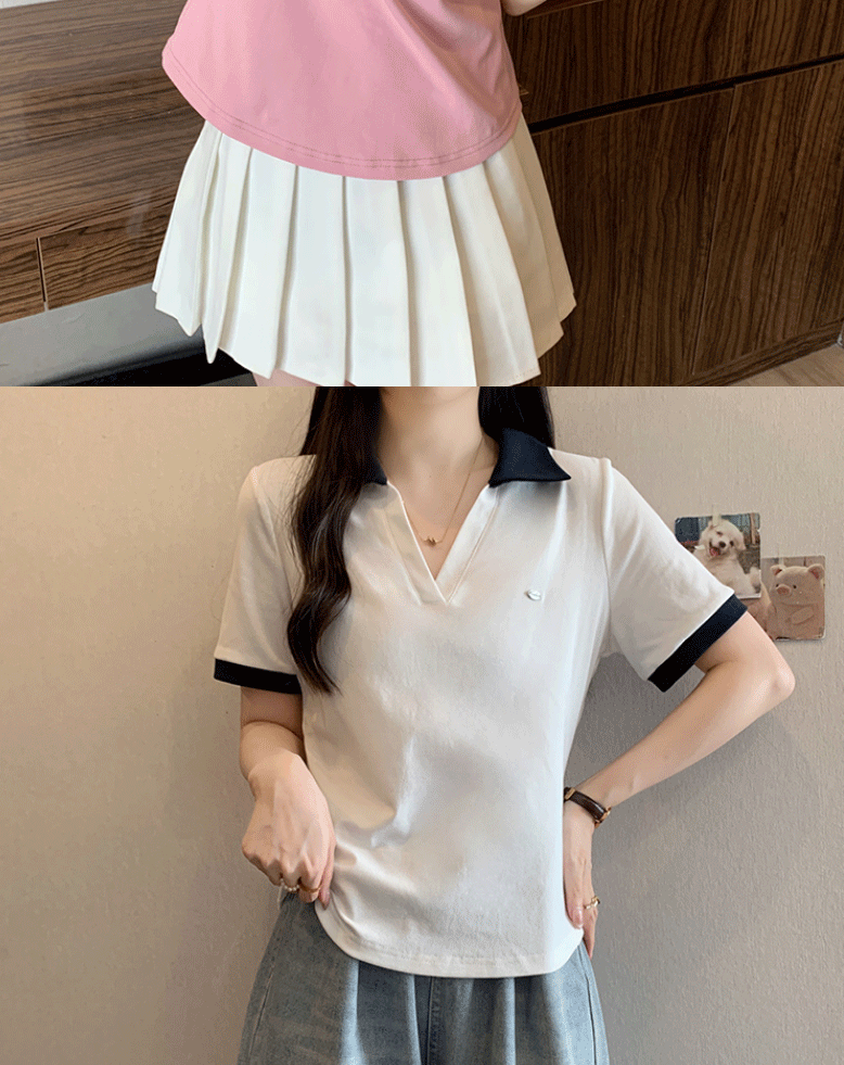 Women's clothing covering belly contrast color v-neck curved shoulder short-sleeved T-shirt female fat MM waist slimming chic tops female